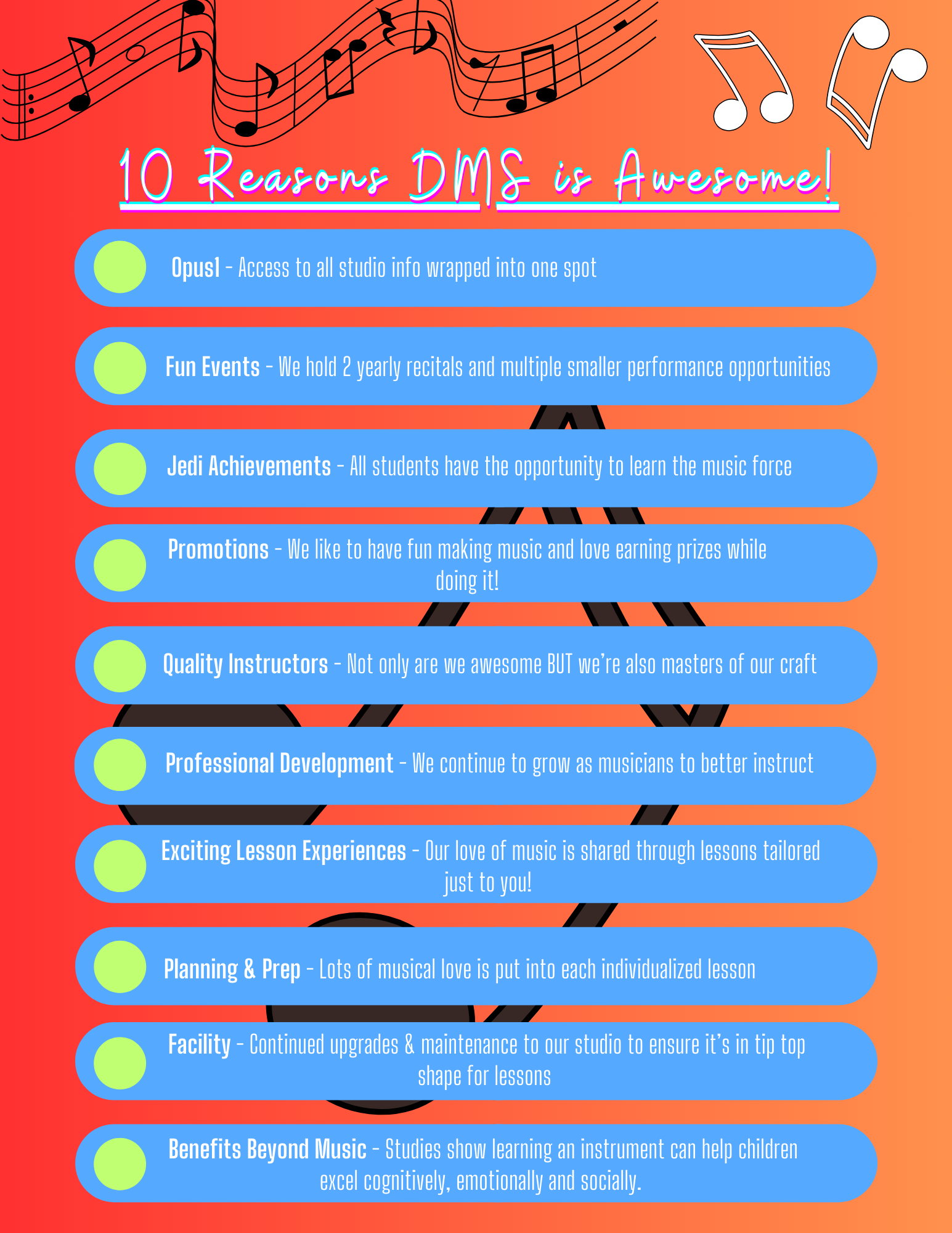Unlike other studios, we never invoice you for any promotions. They are an added incentive to being an awesome student at Dynamic Music Studio. Piano Books, printed or digital sheet music, folders, and even our awesome flash contests are all included!